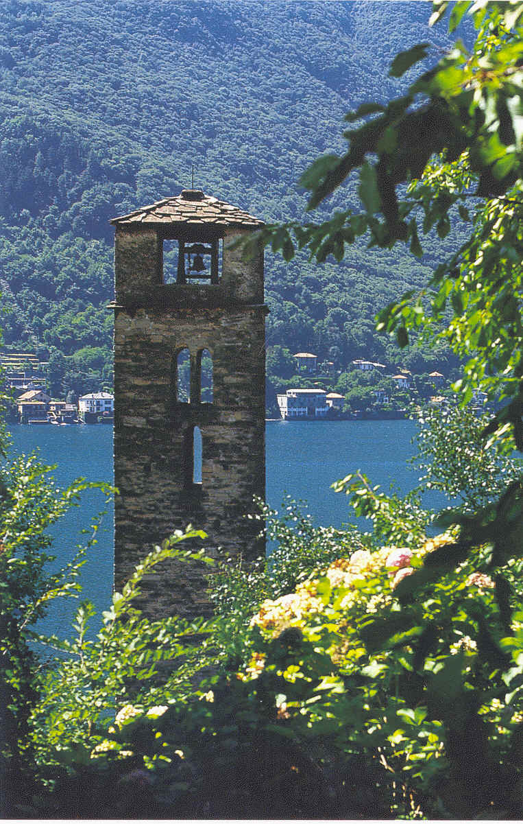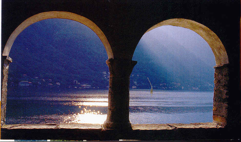 Il lago di Como visto dal porticato della chiesa romanica di San Martino, a Careno